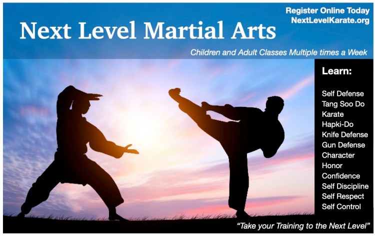 While many martial arts dojos teach what is termed sport karate, or karate designed only for competition within the martial arts framework. We teach practical, life saving self defense, the same techniques currently taught in Korea as part of their military combat tactics. Through Tang Soo Do karate you will not only learn from the martial art that has the largest variety of kicks, but you will learn, knife defense, gun defense, joint manipulation, pressure points, throwing, rolling, and a mastery at a wide variety of martial arts weapons, including sword, staff, nunchaku, sai, kali, and tonfa. You will learn techniques and tactics that can save your life from an attacker either armed or unarmed. In a world that is increasingly unpredictable and often times dangerous can anyone afford not to know how to effectively defend themselves. Gain the confidence you need to stand strong for yourself and for your family, here at Next Level Martial Arts.